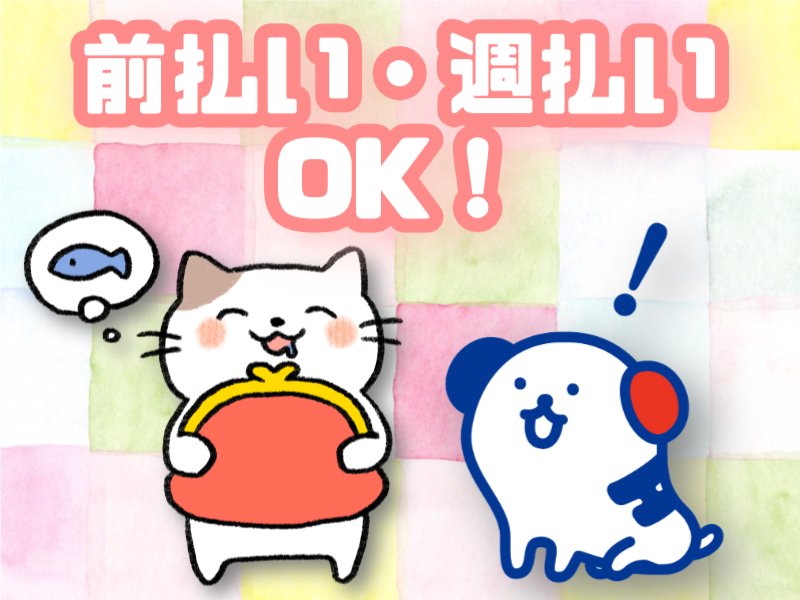 ◆月収例: 日勤:時給1500円×8h×10日=120,000円 夜勤:(時給1500円×3.92h)+(時給1875円×4.083h)×10日=135,313円 +残業代(割増時給×20h)+(深夜時給×20h)=337,813円 ※1日の実働8時間以降の時給:1,875円 ※22時~翌5時までの割増時給:1,875円 ※1日の実働8時間以降かつ22時~翌5時までの割増時給:2250円 ◆給料日:末日 ──────────────── ◆スグにお金がほしい方は・・・!! <日払い/即払い/週払い/前払い◎対応可能> 勤務実績が分かるタイムシートをメールで送る →最短当日に受け取り可能! ※規定あり ※詳細は担当までお問合せください