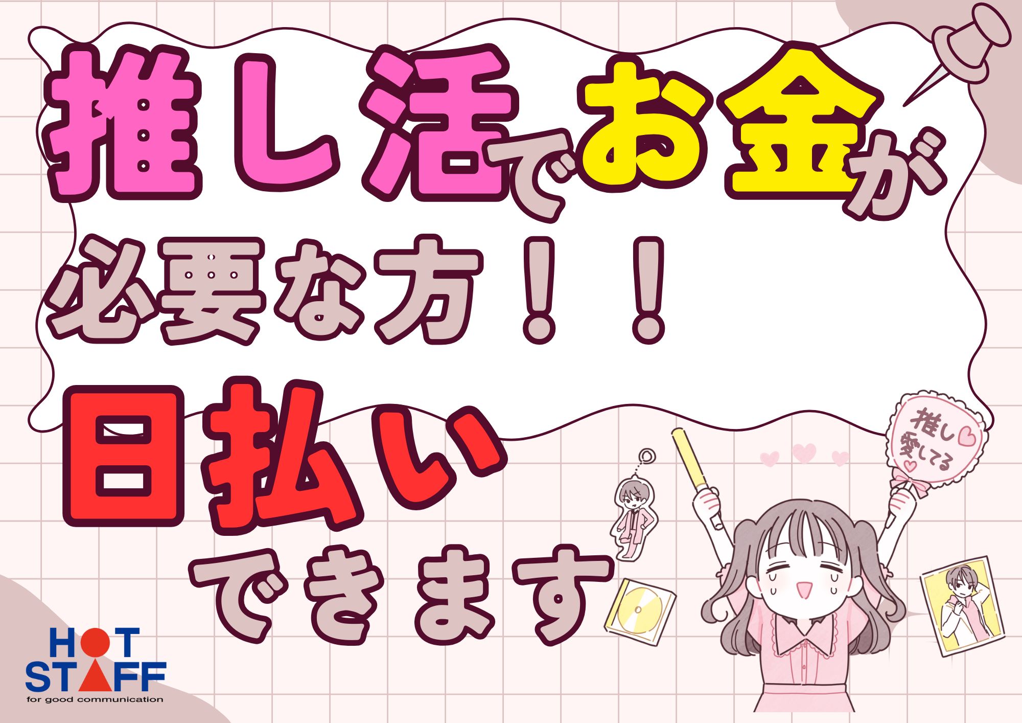 ◆即払い・日払い制度あり  ̄ ̄ ̄ ̄ ̄ ̄ ̄ ̄ ̄ ̄ ̄ ̄ ̄ ̄ ̄ ̄ ̄ ̄ ̄ ̄ ̄ ̄ 最短当日受取も可能!(※ホットスタッフの休業日除く) 『推し活でお金が必要!』『家電が壊れた!』など 急な出費でお困りな際は是非ご活用ください★ ※規定についてはお気軽にお問い合わせください。