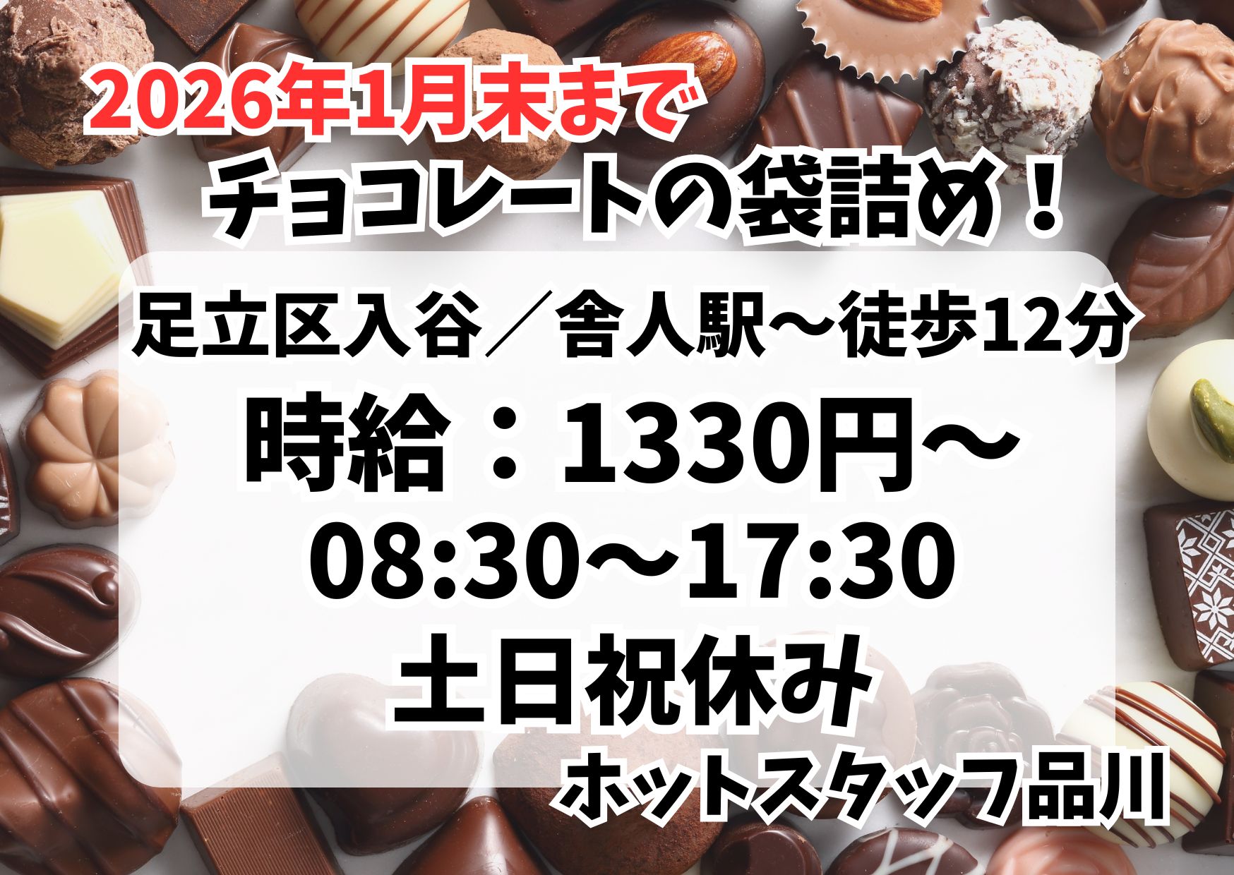 【舎人駅】【2026年1月末までの短期】週5日/土日祝休み!10個・20個単位でチョコレートの袋詰め作業!