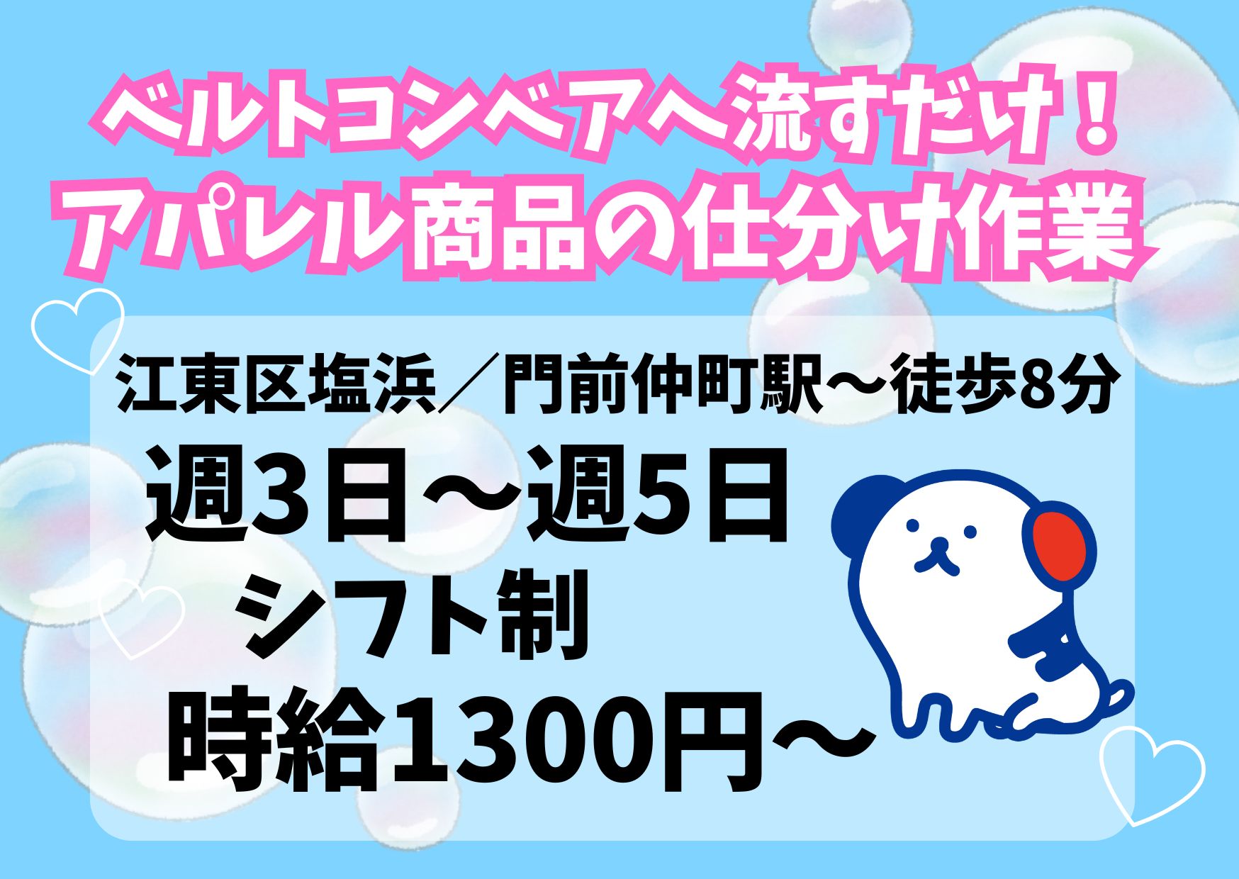 【1日で仕事マスター!】冷暖房完備!週3日~!シフト制!ベルトコンベアへ流すだけ!アパレル商品の簡単仕分け作業!