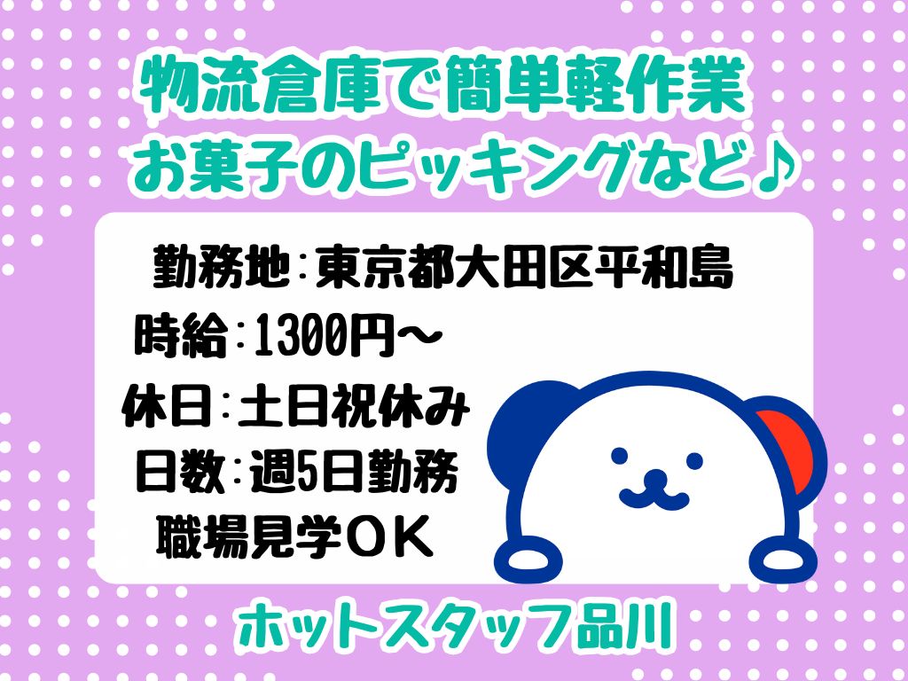 【週5日/土日祝休み】【重いものナシ】お菓子のピッキングや梱包作業<倉庫内軽作業>