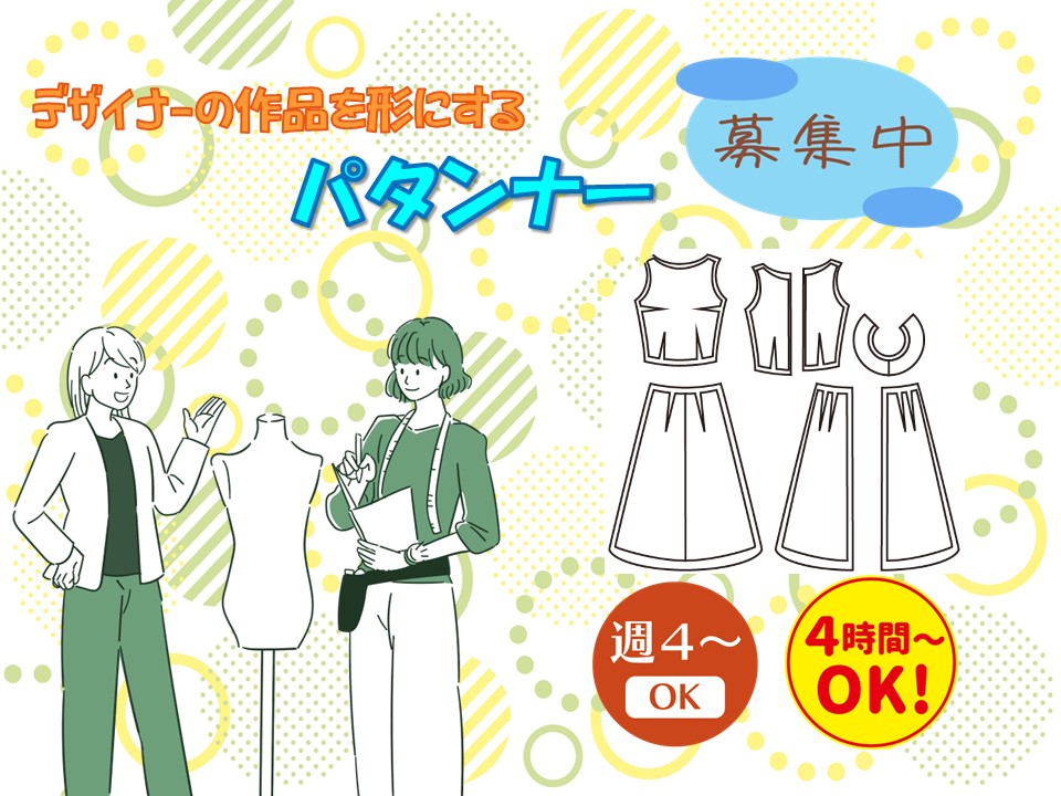 時給アップ!【経験者活躍!】週4~、1日4時間~等相談可能!デザインを「形」にするパタンナーのお仕事