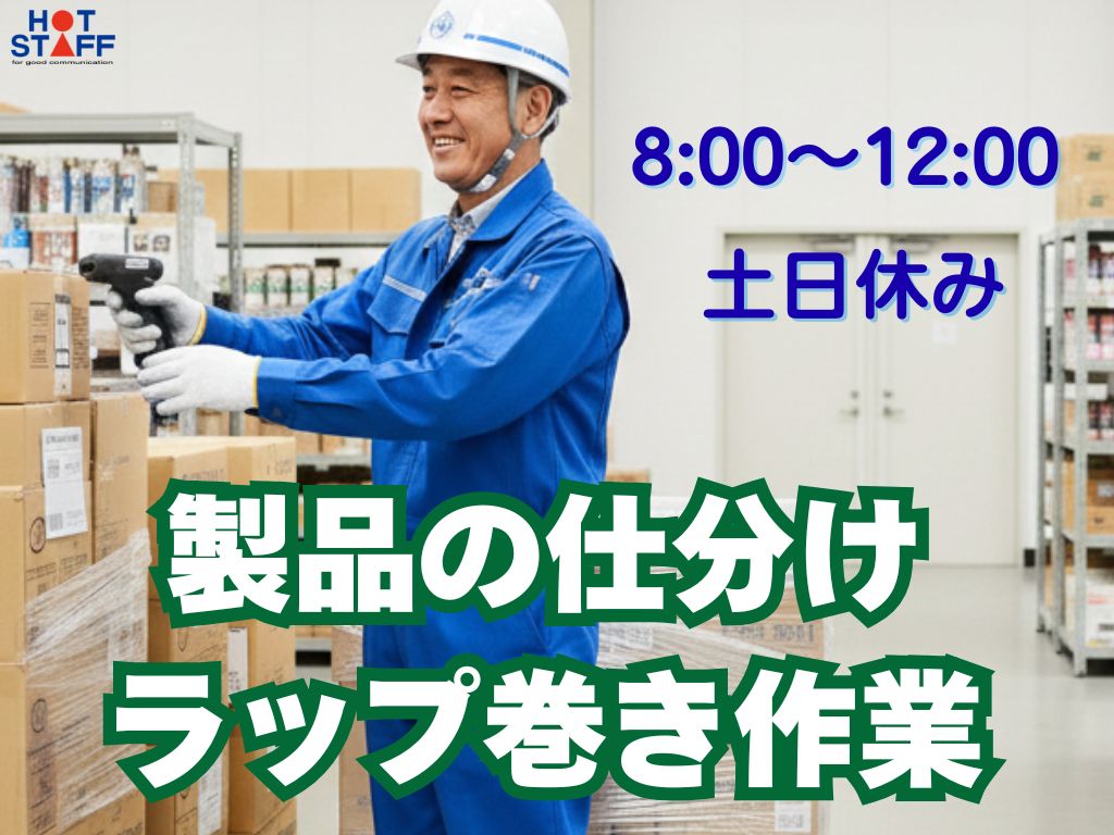 8時~12時の4時間勤務☆土日休み【製品を仕分けてハンディに登録!パレット積みやラップ巻きも♪】