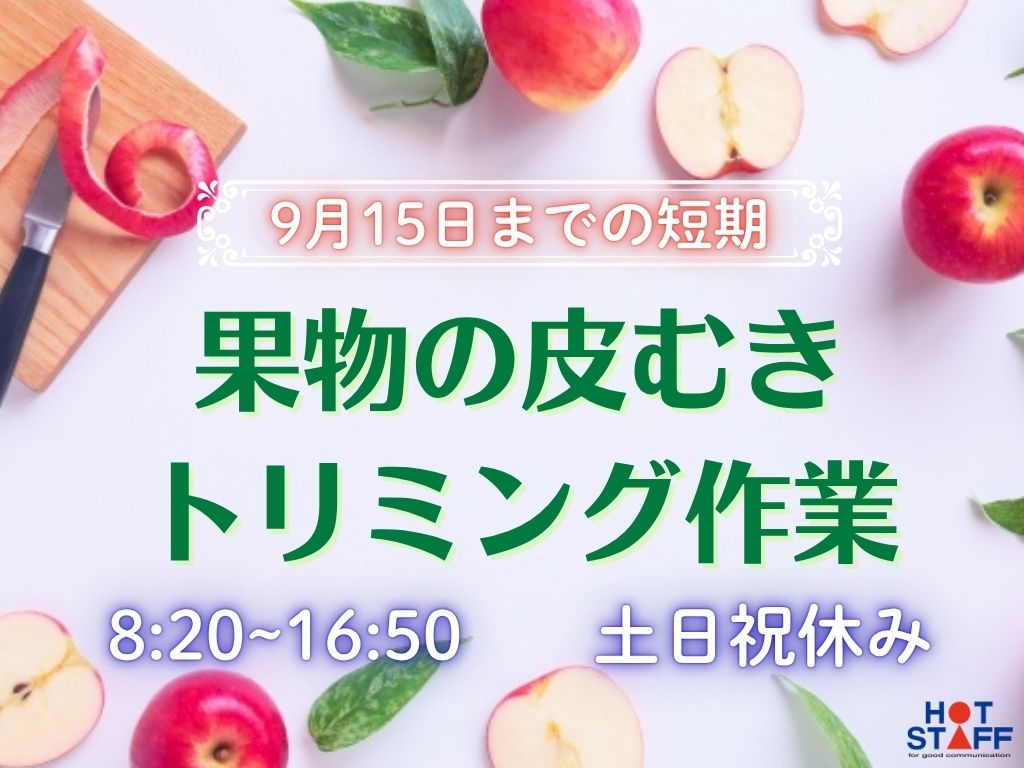 9月15日までの短期☆【ライン作業!果物のむき残りの皮や芯をトリミング】土日祝休み♪髪色自由◎