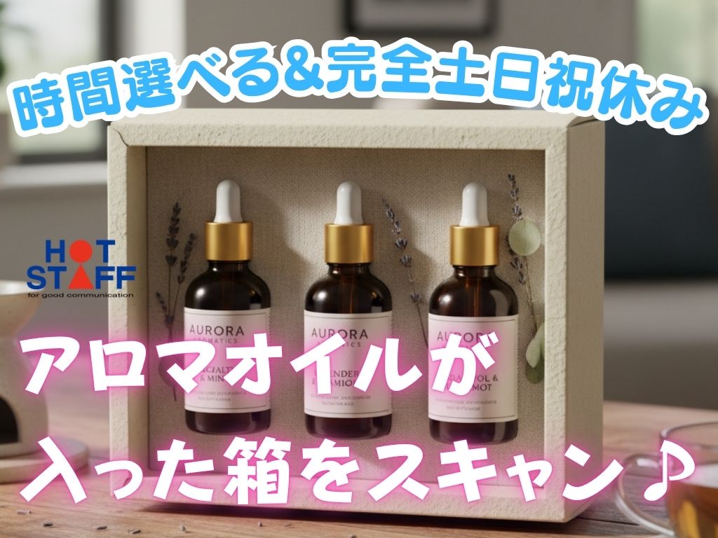《倉庫内作業・アロマオイルが入った箱をスキャン》勤務時間選べる/完全土日祝休み/私服でラフに勤務
