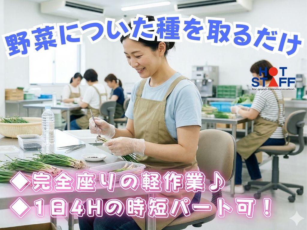 《ピンセットで野菜についた種を取るだけ》完全座りの軽作業/水日休み/9:00〜1日4H勤務もOK★