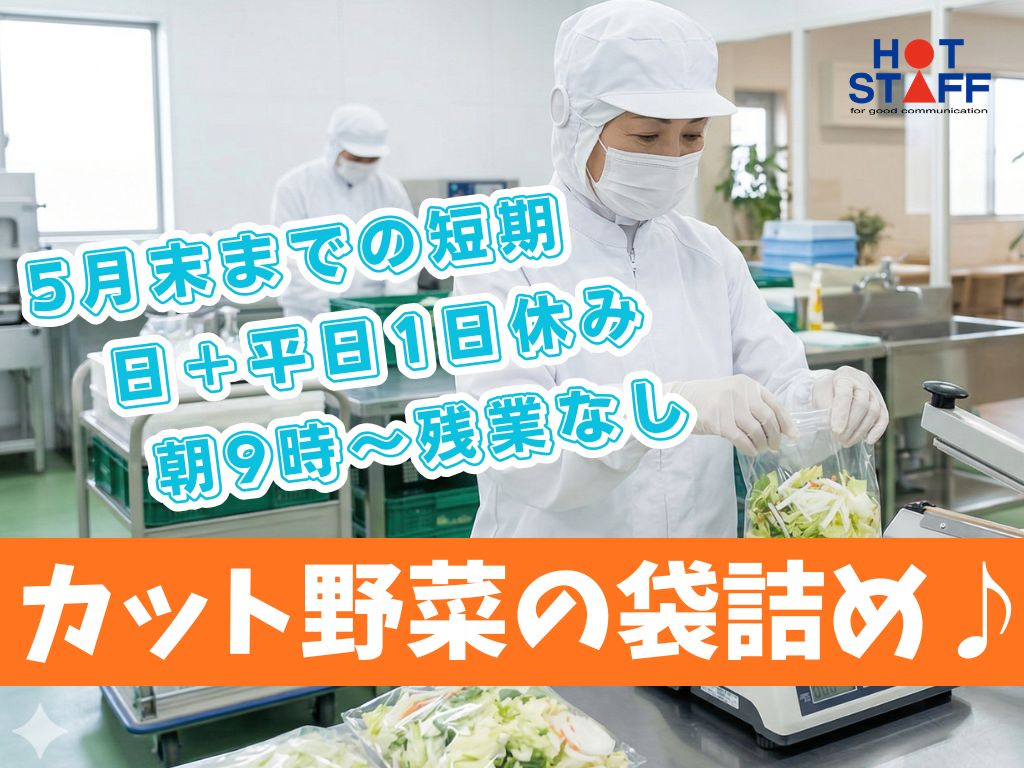 《カット野菜を袋に詰めるだけ》軽作業/5月末までの短期/日曜+好きな平日1日休み/朝9時〜残業なし♪