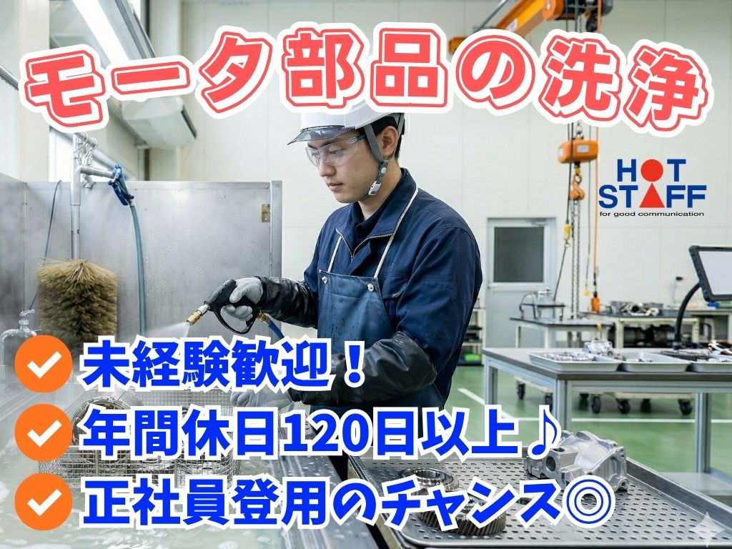 《モータ部品の洗浄スタッフ》未経験歓迎/日勤+残業なし/年間休日120日以上/正社員登用のチャンス◎