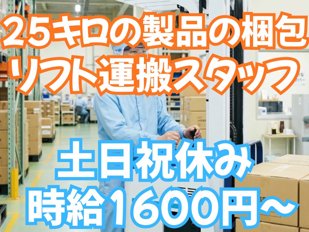 職種25キロの薬をダンボールに箱詰め、リーチリフトで運搬スタッフ