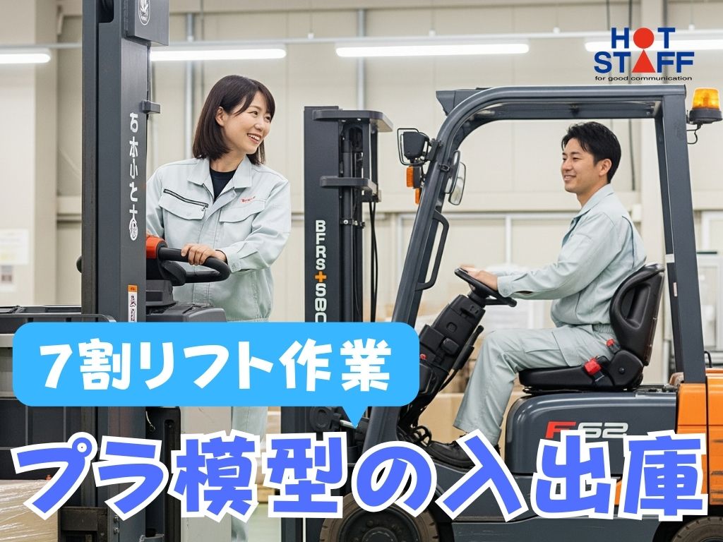 《フォークリフトを使ってプラ模型の入出庫》7割リフト作業/日勤専属で月収26万円以上も可能♪