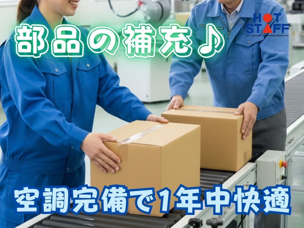 《製造ラインに部品を補充♪》未経験スタート大歓迎/土日休み+残業少なめ/空調完備で1年中快適♪