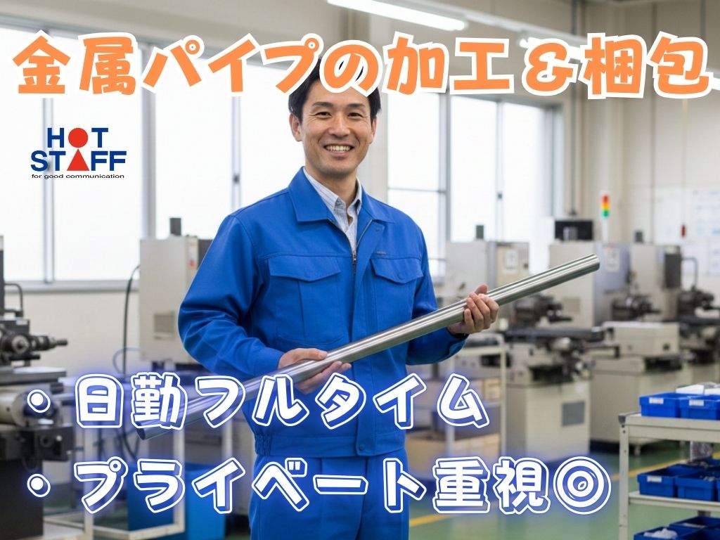 《1つの作業に集中できる♪・金属パイプの加工&梱包》未経験OK/日勤フルタイム/プライベート重視◎