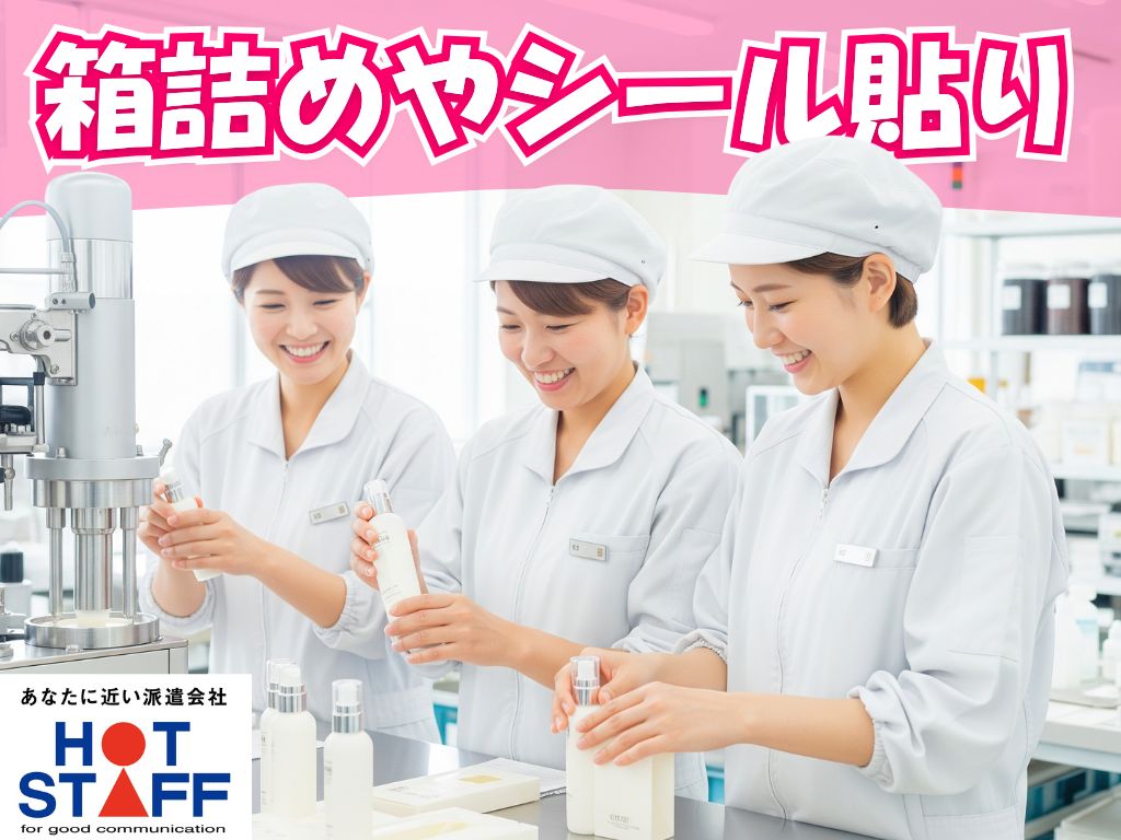 《化粧品のラベルシール貼りや梱包》座り作業あり・かんたん軽作業/完全土日祝休み/9:00~17:00