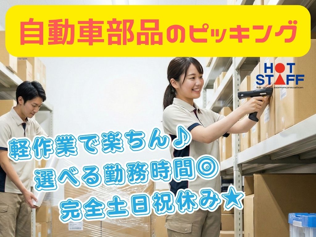 《自動車部品のピッキング》未経験歓迎/倉庫内で軽作業/選べる勤務時間/完全土日祝休み/長く安定勤務◎