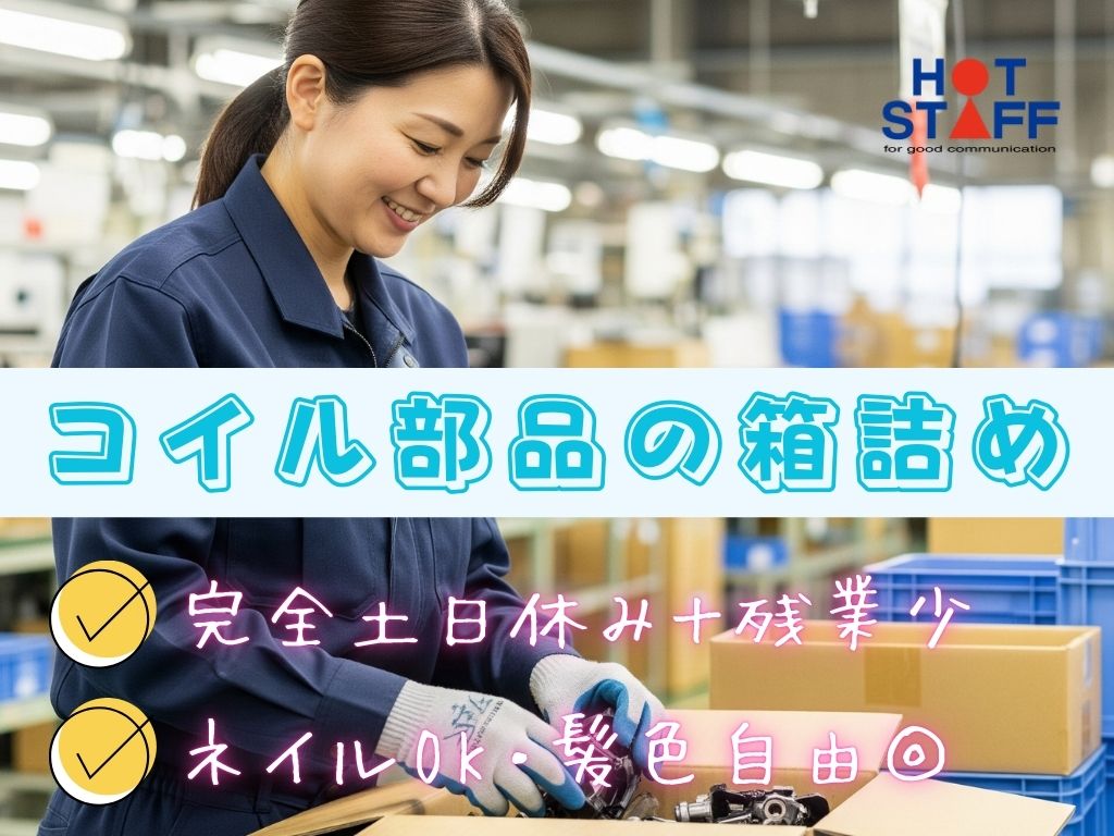 《コイル部品の箱詰め★》1人作業で気楽におしごと♪/完全土日休み+残業少なめ/ネイルOK・髪色自由◎