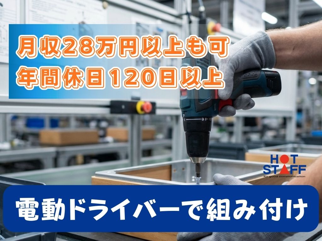 《電動ドライバーで組み付け◎》未経験歓迎/月収28万円以上も可/年間休日120日以上/9時〜18時◎