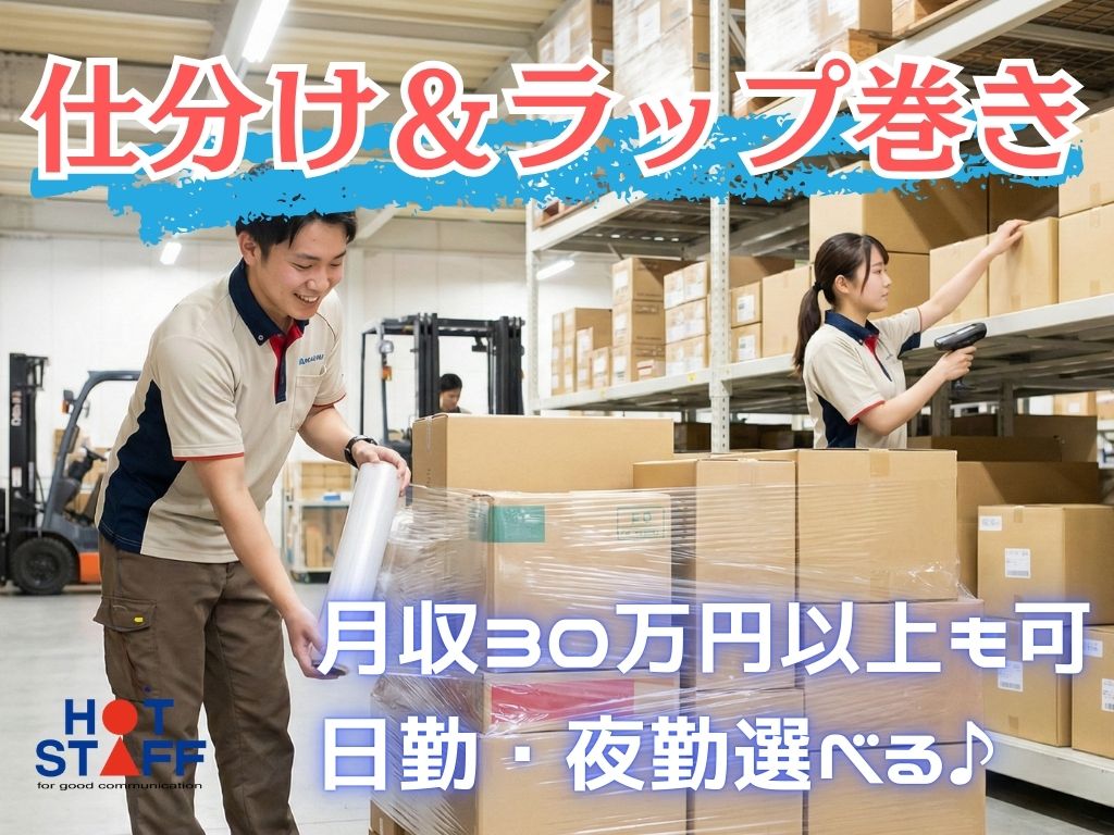 《仕分け&ラップ巻き★》倉庫業はじめてさん歓迎/月収30万円以上も可/日勤・夜勤選べる/3勤1休♪
