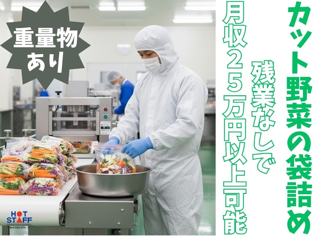 ★残業なしで月収25万円以上可能★ かんたん!カット野菜の袋詰め作業・重量物あり!