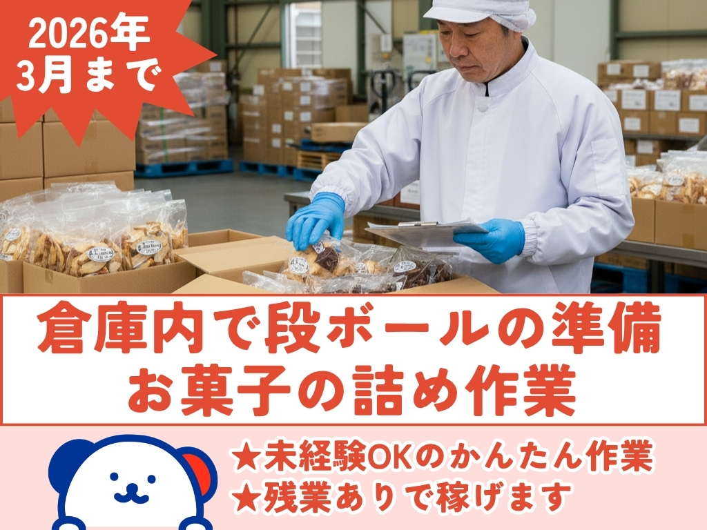 ★2026年3月まで★ 伊豆市/未経験OK!/残業ありで稼げる/倉庫内で段ボールの準備・お菓子の詰め作業
