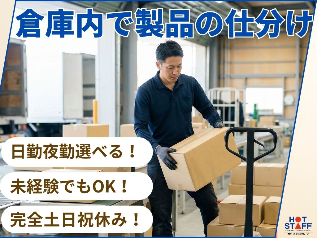 完全土日祝休み!未経験OK◎日勤夜勤選べる!倉庫内で製品の仕分け・運搬のオシゴト♪