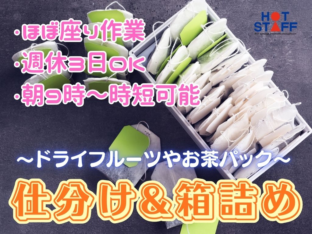 《ドライフルーツの仕分け&ティーパックの箱詰め》ほぼ座り作業/週休3日OK/朝9時〜時短可能