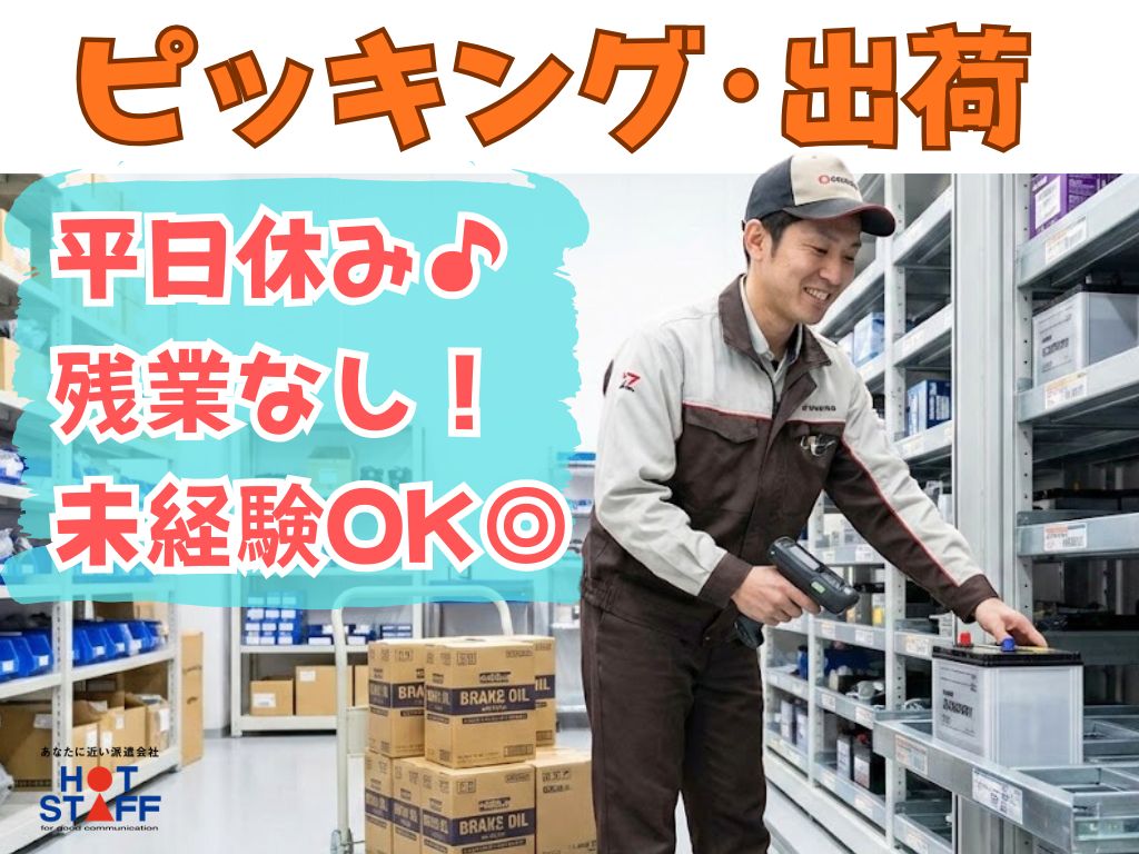 《自動車倉庫内でバッテリーやオイルのピッキング・出荷◎》平日休みあり/8:45〜17:15/残業なし