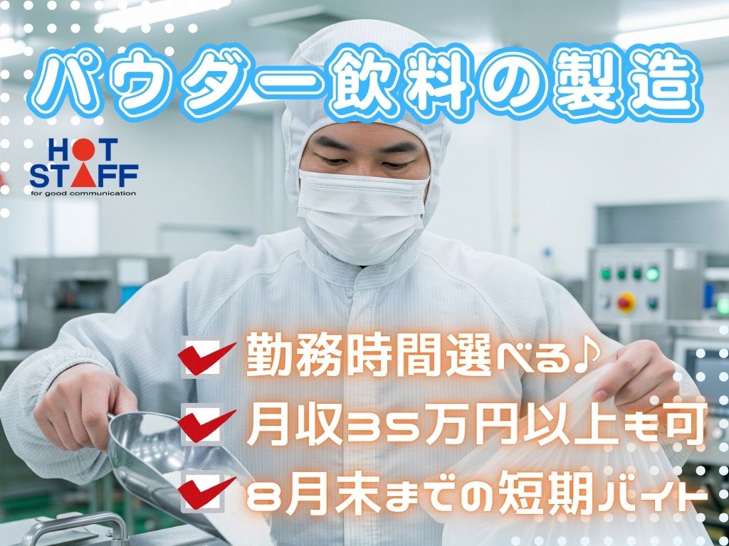 《パウダー飲料の製造スタッフ★》勤務時間選べる/月収35万円以上も可/8月末までの短期バイト◎