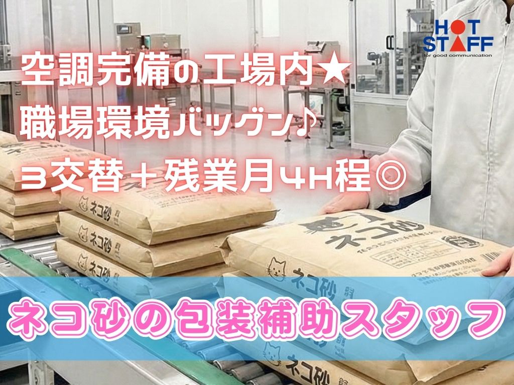 《ネコ砂の包装補助スタッフ♪》未経験歓迎/空調完備の工場内/職場環境バツグン/3交替+残業月4H程★