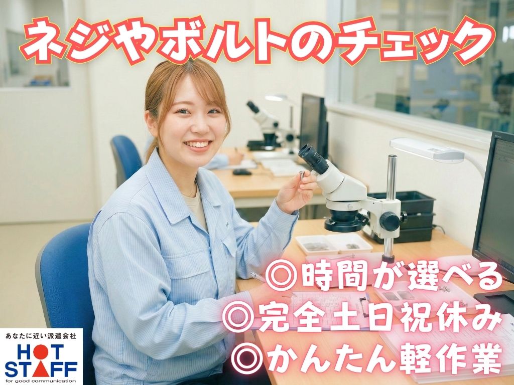 《座り作業メイン★ネジやボルトのチェック》かんたん軽作業/完全土日祝休み/時間が選べる・時短OK