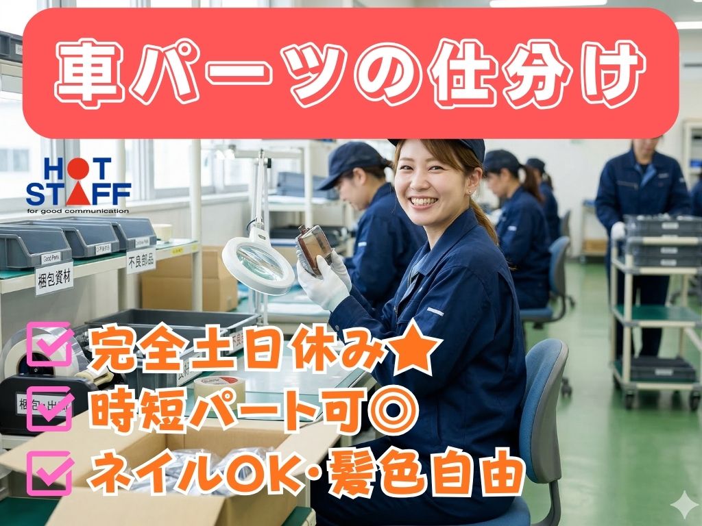 《座りながら車パーツの仕分け★》軽作業/完全土日休み/1日5H〜時短パート可/ネイルOK・髪色自由♪