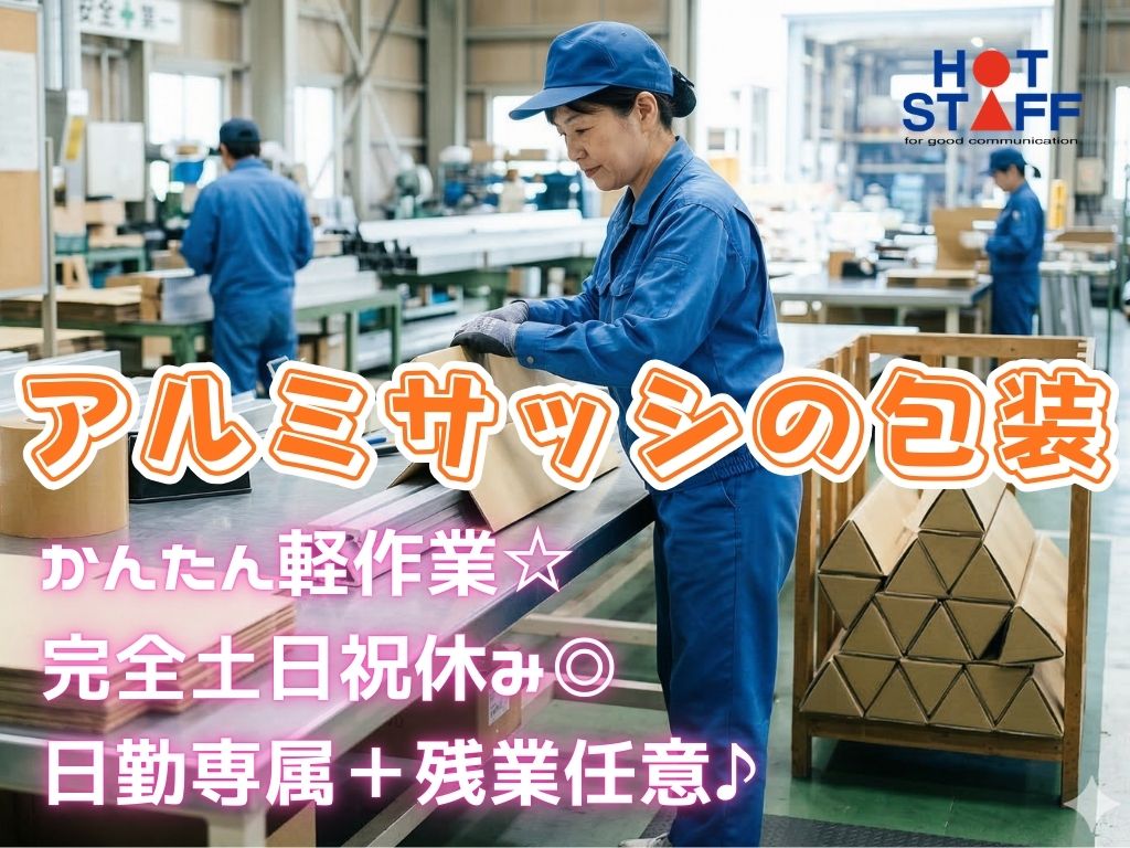 《1本100gのアルミサッシを包装★》軽作業/未経験歓迎/年間休日120日以上/8:30~17:30