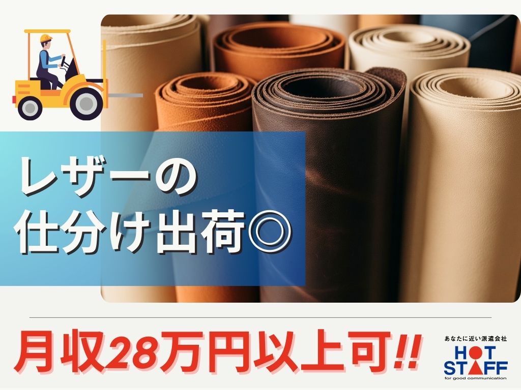 《ロール状のレザーを仕分けてリフトで出荷準備!》月収28万円以上可/二交替制/人間関係◎