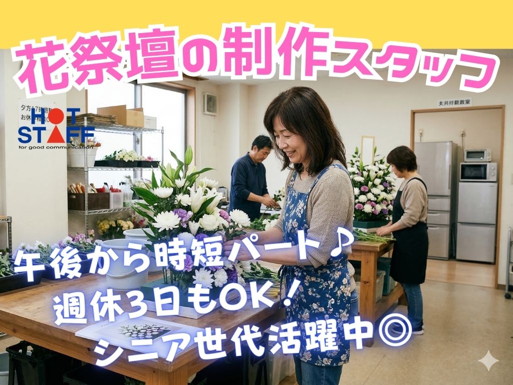《フラワーアレンジメント+花祭壇の制作♪》午後からパートタイム/週休3日もOK/シニア世代活躍!