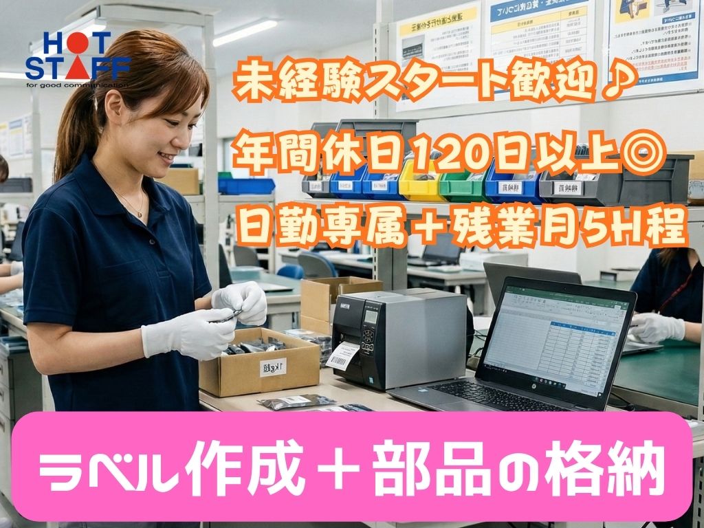 《ラベル作成+部品をしまうだけ★》未経験スタート歓迎/年間休日120日以上/日勤+残業月5H程◎