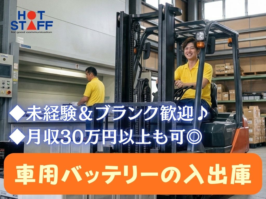 《車用バッテリーの入出庫♪》リフト作業6割/未経験&ブランク歓迎/月収30万円以上も可/2交替★