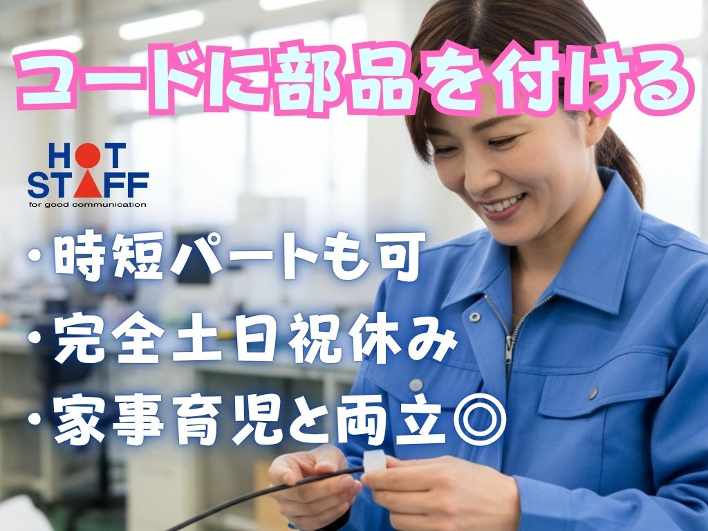 《空調完備の職場・小さい部品をコードにつけるだけ》軽作業で楽ちん/時短パートも可/完全土日祝休み