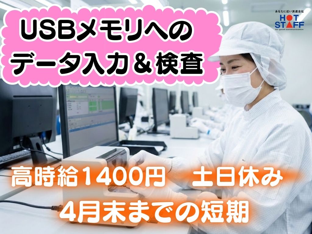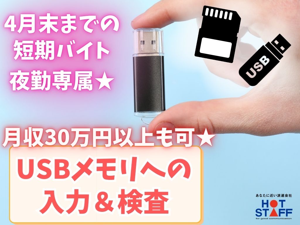 《USBメモリへの書き込み&検査》座り作業/月収30万円以上可/17:30〜の夜勤/4末までの短期