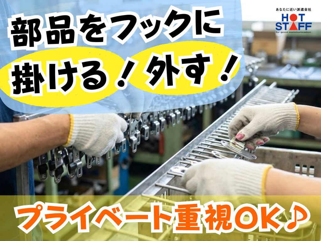 《シートベルト部品をフックに掛けたり外したりの軽作業》完全土日休み/残業なし/髪色自由・ネイルOK
