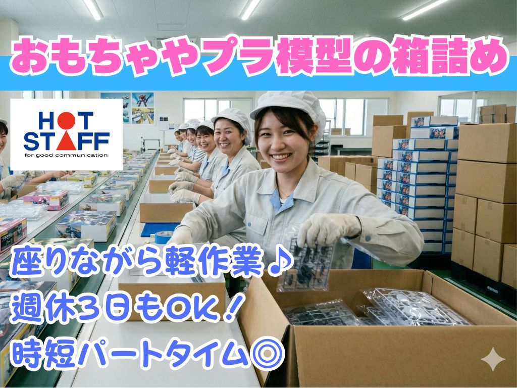 《おもちゃやプラ模型の箱詰め》軽作業/週休3日もOK/8:30~16:30の時短/私服でラフに勤務◎