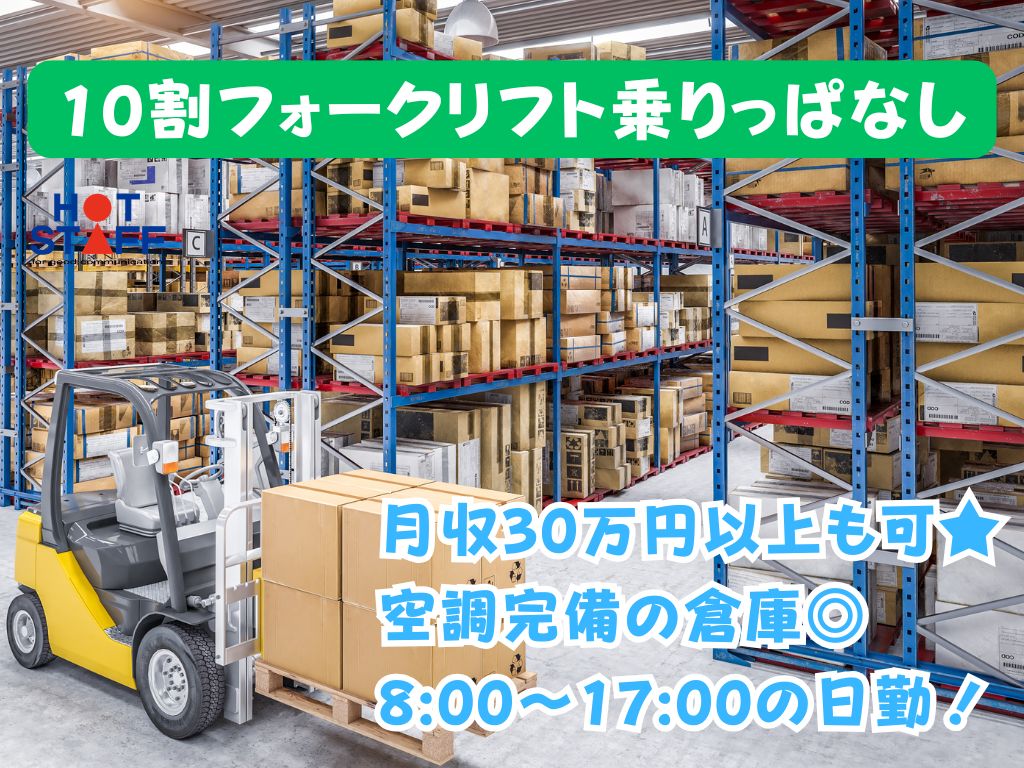 《10割フォークリフト乗りっぱなし》月収30万円以上も可/空調完備の倉庫/8:00〜17:00勤務◎