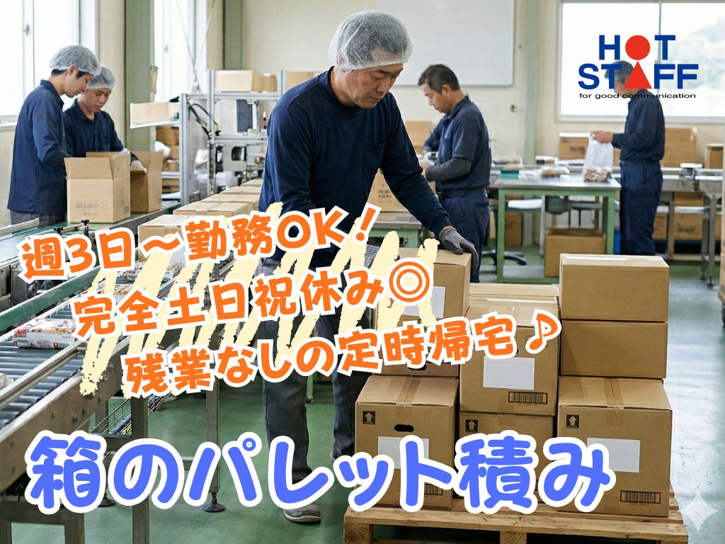 《箱のパレット積み》シンプル作業で安心/週3日から勤務OK/完全土日祝休み/残業なしの定時帰宅◎