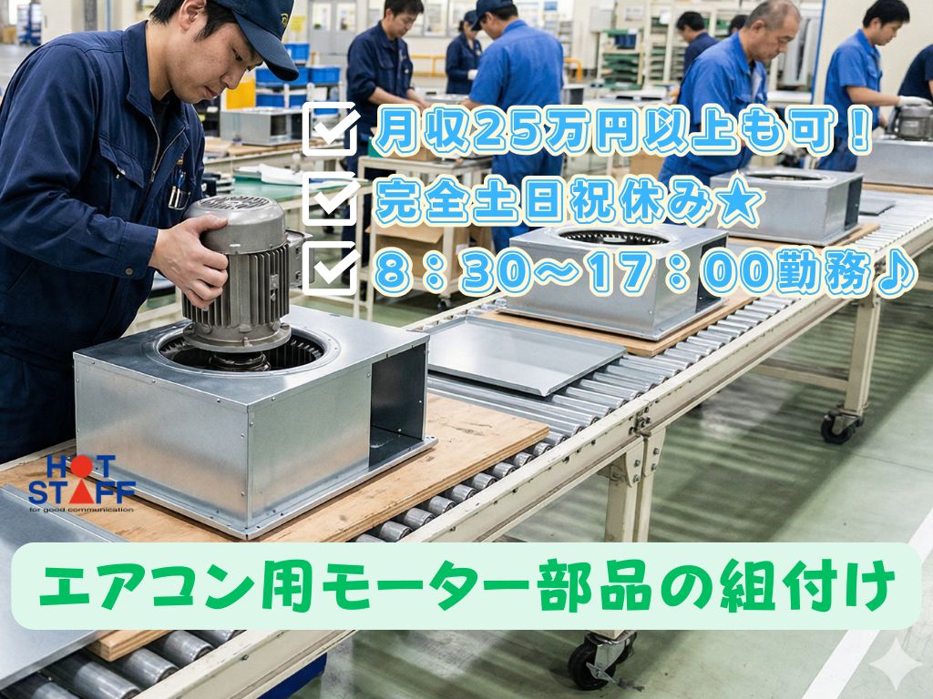 《エアコン用モーター部品の組付け★》未経験歓迎/月収25万円以上も可/日勤/年間休日120日以上◎