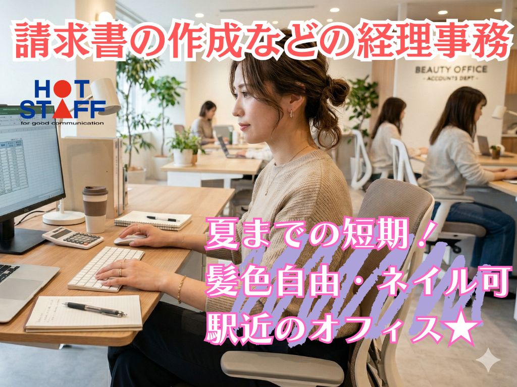 《請求書の作成・経費計算》夏までの短期/完全土日祝休み/時短パートもOK/髪色自由・ネイル可/駅近◎