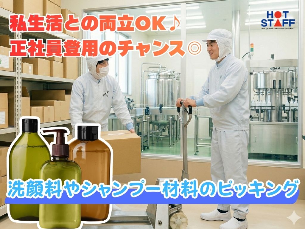 《洗顔料やシャンプー材料のピッキング★》完全土日祝休み/日勤専属+残業なし/正社員登用のチャンス◎