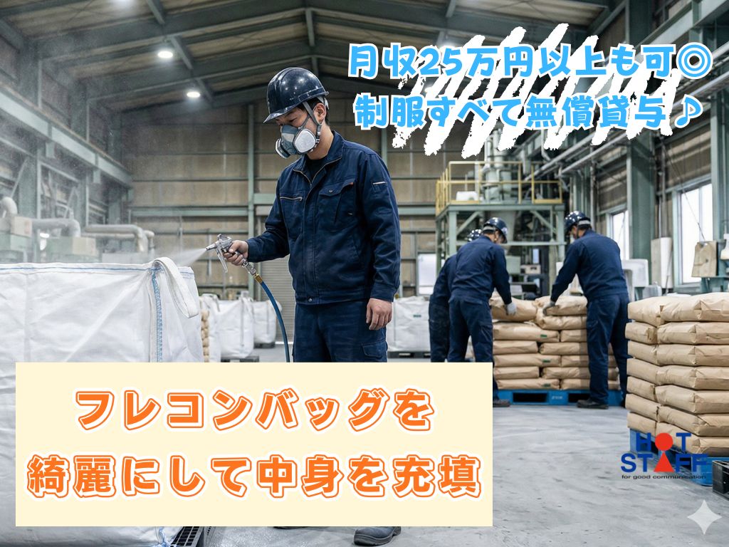 《フレコンバッグを綺麗にして中身を充填♪》未経験歓迎/月収25万円以上も可/日勤/制服すべて貸与◎