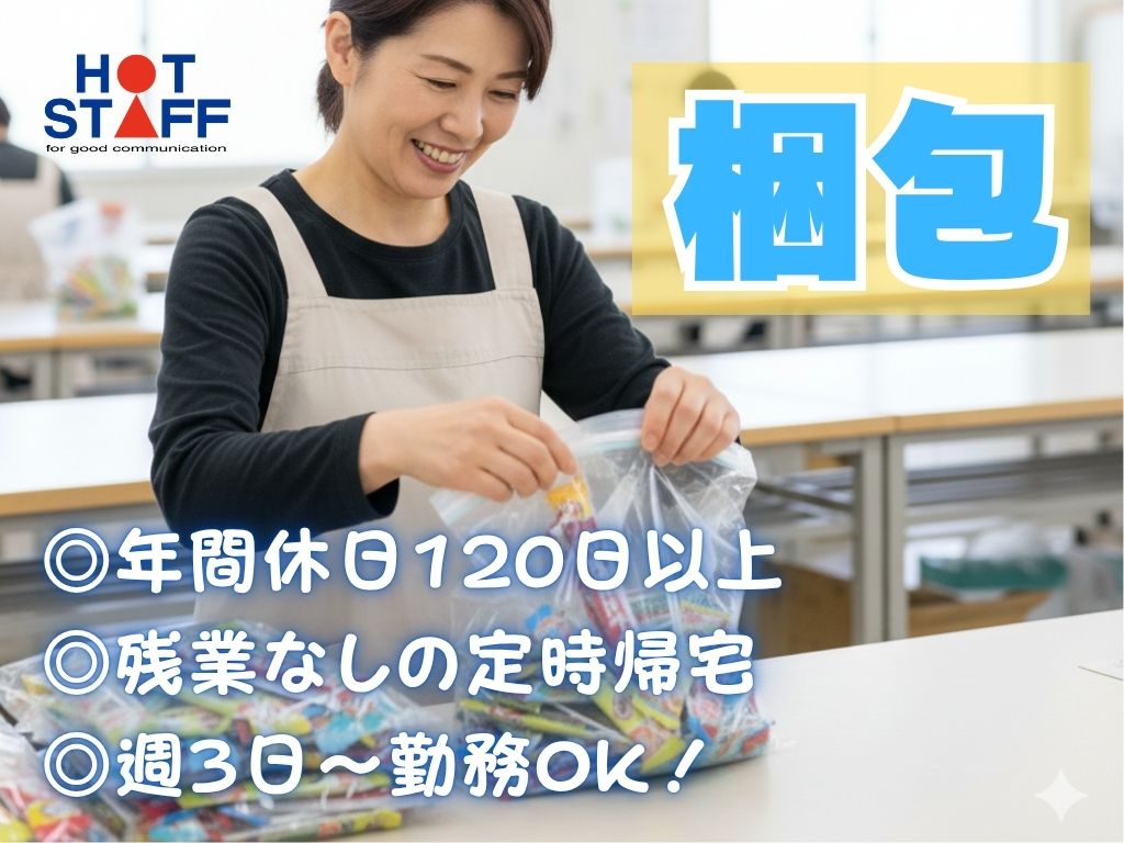 《缶コーヒーやペットフードの梱包》軽作業/年間休日120日以上/日勤+残業なし/週3日〜勤務OK!