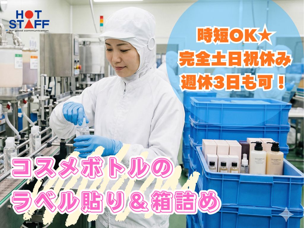 《コスメボトルのラベル貼り&箱詰め♪》軽作業/朝9時〜時短もOK/完全土日祝休み/週休3日も可!