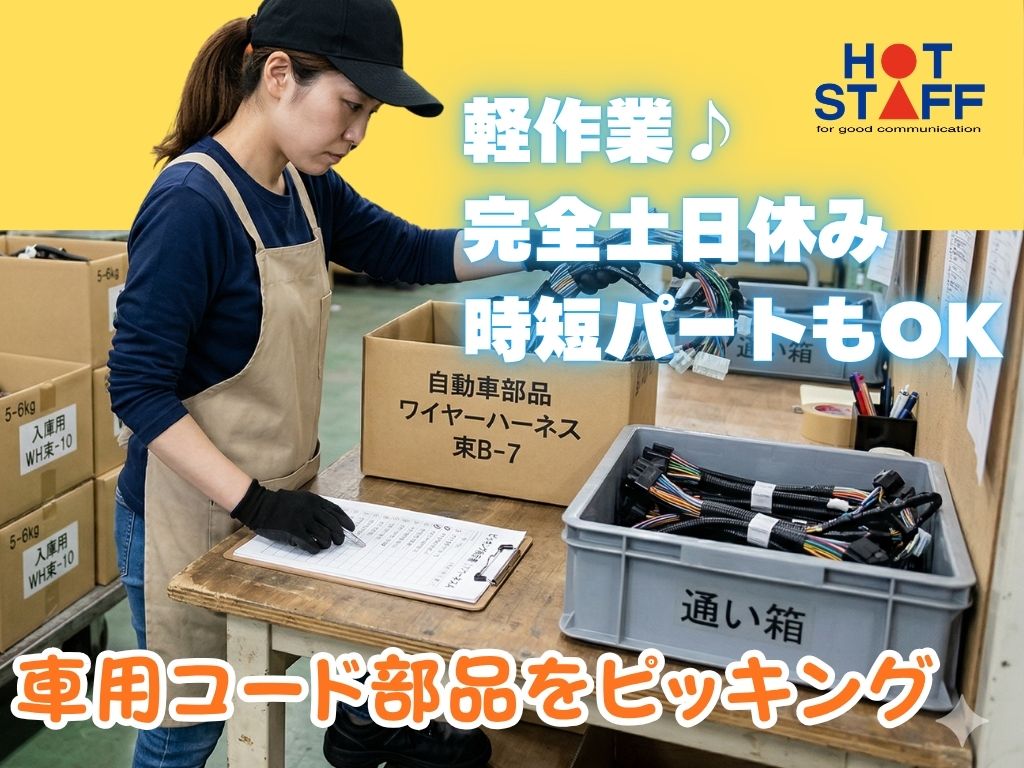 《車用コード部品をピッキング◎》未経験歓迎/軽作業/完全土日休み/16:30までの時短もOK♪