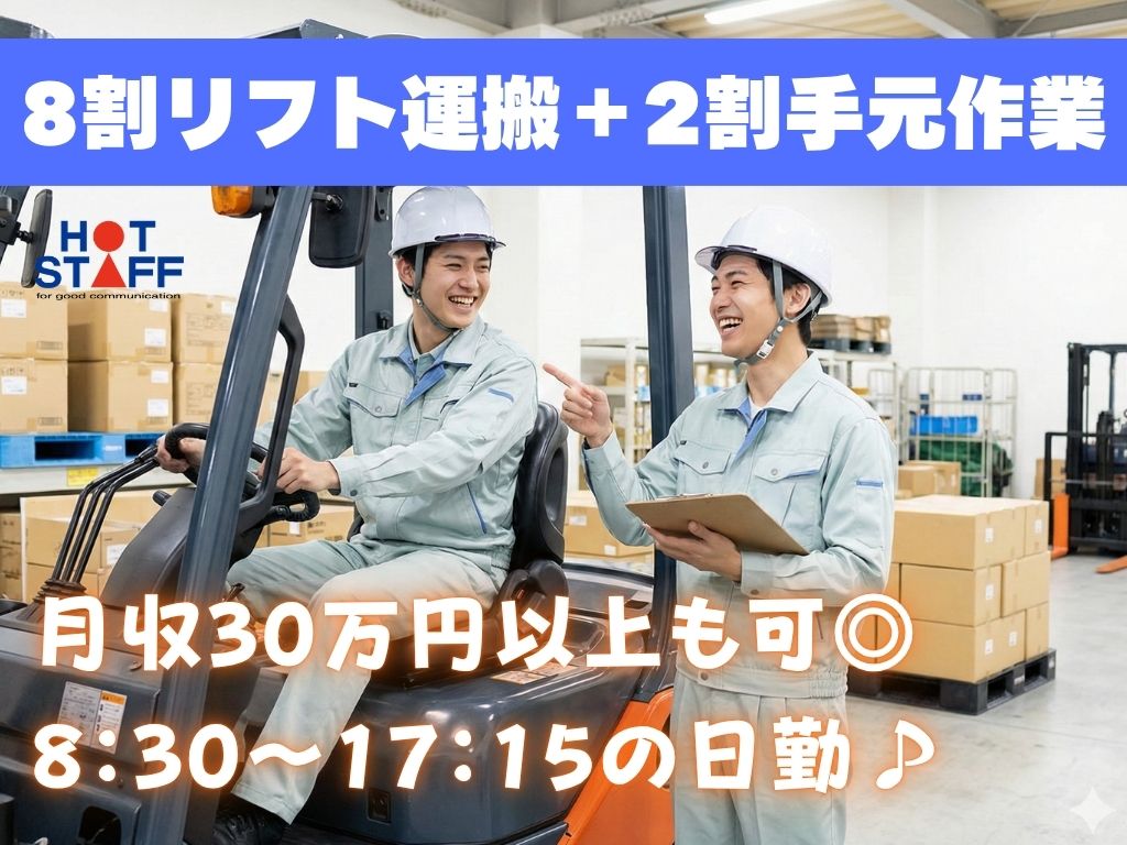《8割リフト運搬+2割手元作業★》月収30万円以上も可/8:30~17:15の日勤専属/土日祝休み♪