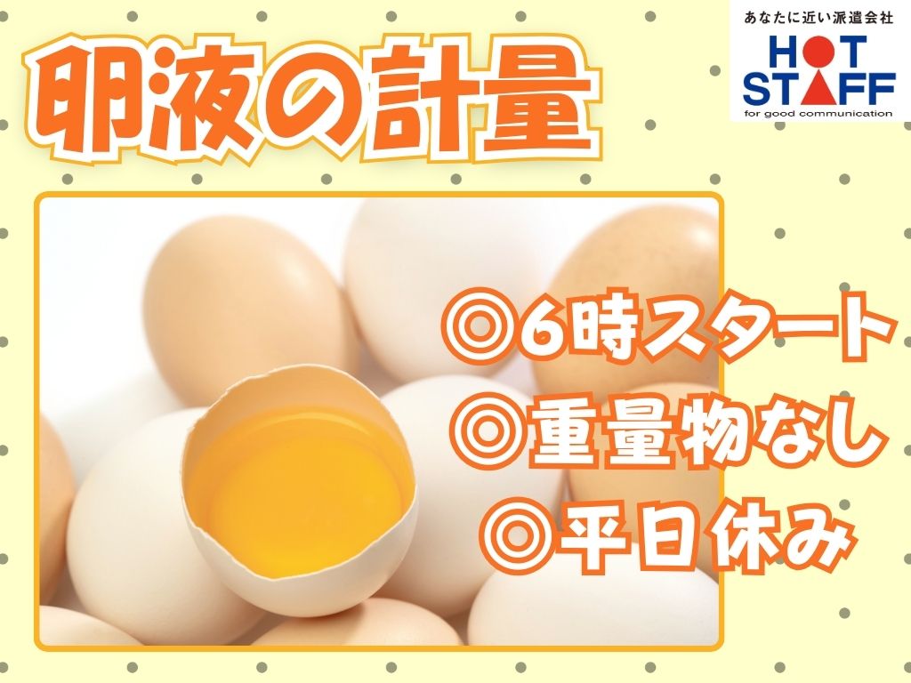 《未経験OKのかんたん作業◎ボタンをポチっと押して卵液の計量》軽作業/平日休み/6:00~15:00